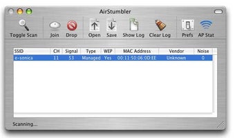 Estamos frente a un stumbler, es decir un rastreador de redes wifi. Lo único que nos será imprescindible tener, es una tarjeta AirPort para poder detectar la presencia de redes inalámbricas en la zona, y AirStumbler para conectarse de forma automática a ellas; brinda soporte para WEP.